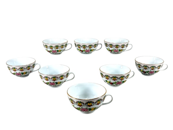• PORCELANA ORIENTAL, oito (8) xícaras para chá, confeccionados em porcelana na tonalidade branca, decorada por flores, folhagens e frutos em rica policromia com filetes e realces em ouro, medindo 5,5x11,5x9,5cm. Não acompanham pires.