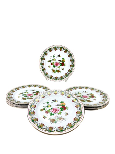 • PORCELANA ORIENTAL, nove (9) pratos para sobremesa confeccionados em porcelana na tonalidade branca, decorada por flores, folhagens e frutos em rica policromia com filetes e realces em ouro, medindo 18cm de diâmetro.