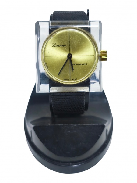 • RELÓGIO, um (1) relógio de pulso da marca Lucerne (marca suíça de relógios associada à produção de modelos mecânicos de estilo clássico, difundidos especialmente em meados do século XX), com movimento mecânico, caixa quadrangular em acrílico translúcido, mostrador dourado com pequenas falhas na lateral, vide foto, modelo Antimagnetic, pulseira em couro preto necessitando troca, não testado e sem garantia de funcionamento, caixa medindo 3,5x3,5cm.