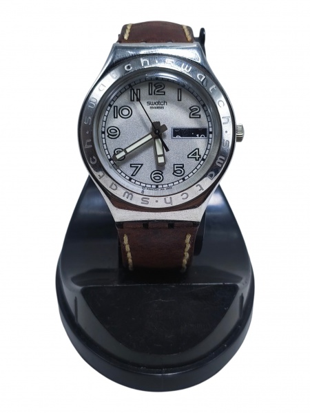 • RELÓGIO, um (1) relógio de pulso da marca Swatch (marca suíça fundada em 1983, reconhecida mundialmente por seus relógios de design marcante e pela renovação da relojoaria suíça no mercado contemporâneo), com movimento quartz, caixa circular em material sintético e metal, mostrador claro com numeração arábica, calendário, pulseira em couro marrom, verso com gravações da marca, excelente estado de conservação com leves sinais de uso, caixa medindo 3,5cm, não testado e sem garantia de funcionamento.