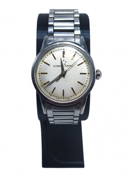 • RELÓGIO, um (1) relógio de pulso da marca ETERNA-MATIC (tradicional relojoaria suíça ligada à manufatura Eterna, reconhecida especialmente por seus relógios automáticos de qualidade e por sua relevância na história da relojoaria do século XX), com caixa e pulseira em aço, mostrador prateado com marcadores lineares e desenho clássico. leves sinais de uso, não testado e sem garantia de funcionamento, caixa medindo 3cm.