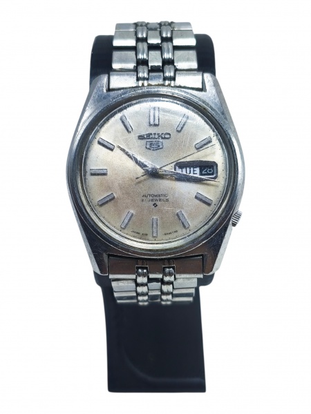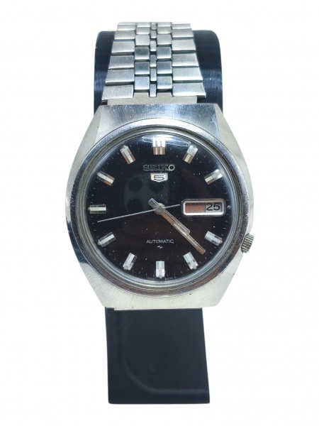 • RELÓGIO, um (1) relógio de pulso da marca Seiko 5 (tradicional marca japonesa fundada em 1881, reconhecida mundialmente pela qualidade de seus relógios e pela relevância histórica na relojoaria, inclusive como uma das pioneiras na popularização dos mecanismos automáticos e quartz), com movimento automático, caixa circular em aço, mostrador claro com calendário duplo de dia e data, pulseira em aço, fundo c/ numeração 6119-8090, 049730, apresentando sinais do tempo e do uso, riscos no visor, funcionando, porem, sem garantias futuras, caixa medindo 3,5 cm.