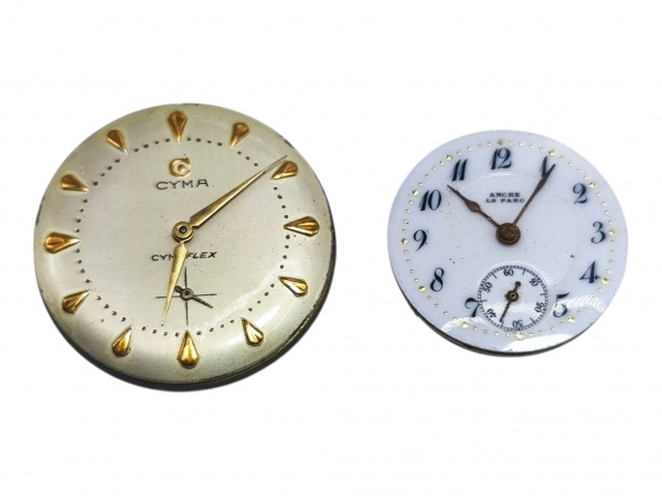 • RELÓGIOS, duas (2) máquinas/mostradores de relógio, sendo: A) conjunto da marca Cyma Cymaflex (tradicional marca suíça de relojoaria, fundada em 1862, reconhecida pela produção de relógios mecânicos de boa qualidade e longa tradição no mercado), com mostrador claro, marcadores dourados, pequeno segundeiro e máquina aparente no verso, apresentando sinais do tempo e do uso, não testado e sem garantia de funcionamento, caixa medindo 3cm e B) conjunto da marca ANCRE LE PARIS, mostrador em porcelana esmaltada, numeração arábica, pequeno segundeiro e máquina avulsa, apresentando sinais do tempo, trincas e bicados no mostrador. não testado e sem garantia de funcionamento, vendidos no estado da foto.