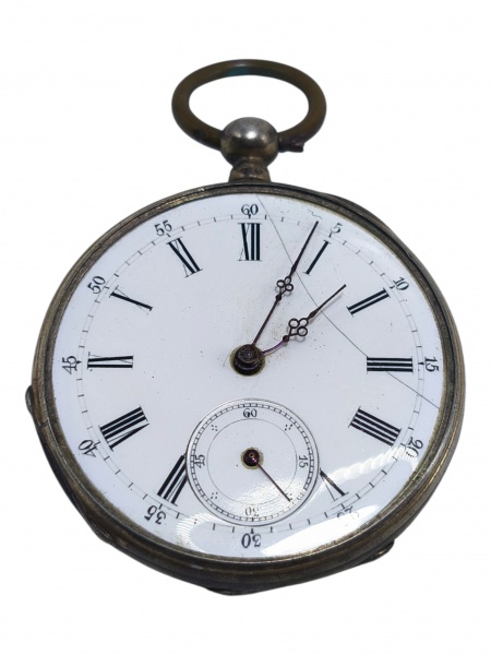 • RELÓGIO, um (1) relógio de bolso, confeccionado em PRATA DE LEI, com mostrador branco apresentando fio de cabelo, numeração em algarismos romanos e pequeno segundo na porção inferior. Caixa com tampa posterior apresentando decoração floral em relevo. Interior com mecanismo aparente, sendo somente a tampa interna do maquinário em metal, apresentando a numeração 157419. Peça com sinais do tempo e do uso, inclusive oxidações e ausência do visor, vendido no estado da foto, caixa medindo 5x4cm.