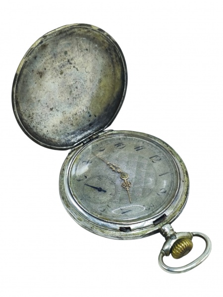 • RELÓGIO, um (1) relógio de bolso, confeccionado em PRATA DE LEI, contrastado 0,800, com mostrador decorado em reserva geométrica na tonalidade cinza, numeração em algarismos arábicos e pequeno segundo na porção inferior. Caixa com tampa externa guilhochada, apresentando monograma aplicado ao centro em douração. Tampa interna com numeração 314247. Apresenta marcas de uso e do tempo, não testado e sem garantia de funcionamento, caixa medindo 5cm sem a coroa e peso total bruto 71,9g.