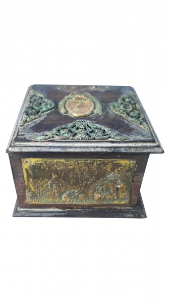 • DIVERSOS, uma (1) caixa porta joias, quadrangular, confeccionada em madeira escura, possivelmente jacarandá, apliques de placas laterais em metal dourado com cinzelado de cena campestre, tampa por elementos vegetalistas e cabochão ao centro, apresenta desalinhamento na tampa, sinais de cola na base, vendida no estado, medindo 9x14x13cm.