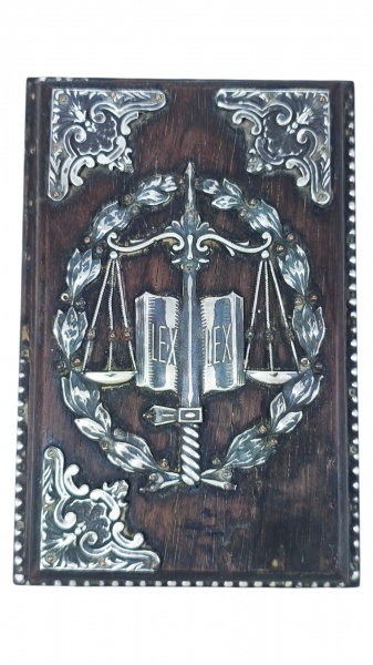 • DIVERSOS, um (1) porta bloco, confeccionada em madeira escura, possivelmente jacarandá, guarnição em PRATA DE LEI cinzelado por balança, espada, livro aberto com inscrição LEX e guirlanda de louros, cantoneiras ornamentadas, bordas com acabamento em perolados com falhas, vide foto, ausência de 2 pés, medindo 18x12cm.