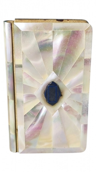• ARTE SACRA, um (1) exemplar intitulado Pequeno Officio dos Domingos, em diminutas dimensões, com capa revestida em madrepérola formando decoração geométrica em desenho radial, apresentando ao centro reserva com monograma, lombada e bordas com acabamento dourado, miolo impresso em português, contendo orações e exercícios de piedade para os domingos, confissão e comunhão, marcas do tempo e sinais de uso, medindo 9,5x5,5cm.