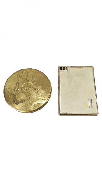 • ACESSÓRIOS FEMININOS, lote com duas (2) peças, confeccionadas em metal dourado, sendo: A) EAGLE, 1 cigarreira decorada por colagem granulada em tom de areia, estampado ARY PARREIRAS, isqueiro interno necessitando revisão, medindo 11x8cm e B) 1 caixa porta pó, cinzelado por elementos florais, marcação suíça interna e quebra no fecho, vendido no estado, medindo 10cm.