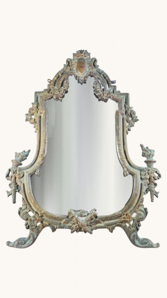• BRONZE, um (1) grande espelho de mesa, confeccionado em bronze, ricamente cinzelada por cornucopias, laçarotes, caneluras, fitas cruzadas, elementos florais e vegetalistas em recortes, apoiada sobre dois pés representando cabeça de peixe, necessita polimento, 1 pé traseiro com quebra e sinais de oxidação no espelho, medindo 50x38cm.