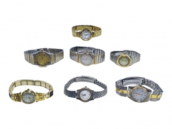 • RELÓGIOS, lote com sete (7) relógios de pulso de modelos, tamanhos, decorações distintas, confeccionados em metal prateado/dourado, vendidos no estado da foto, não testados e sem garantia de funcionamento, maior caixa medindo 3cm e menor 2,5cm.