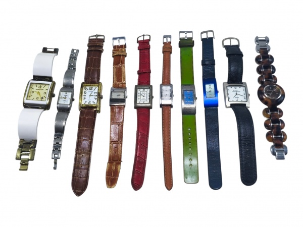 • RELÓGIOS, lote com dez (10) relógios de pulso, de modelos, tamanhos, decorações e materiais distintos, vendidos no estado da foto, sem garantia de funcionamento ou autenticidade, maior caixa medindo 3,5x3,5cm e menor 3,5x1,5cm.