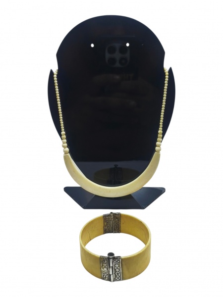 • JOIAS, duas (2) peças, confeccionadas em MARFIM, sendo: A) 1 gargantilha com contas esféricas, pingente arqueado e fecho de rosca, medindo 36,5cm e B) 1 bracelete liso com guarnições em metal com cinzelado floral, apresenta fio de cabelo, medindo 6cm.
