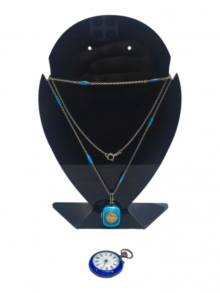 • JOIA e RELÓGIOS, lote com duas (2) peças, confeccionadas em PRATA DE LEI, sendo: A) um (1) colar em metal branco, de elos finos, com aplicações ovais em esmaltação azul, pingente em forma de relógio/medalhão, também, com esmaltação azul claro, medindo 83cm de comprimento e B) 1 pequeno relógio de bolso/pingente, confeccionado em PRATA DE LEI 800 com esmaltagem azul decorado por elementos florais, mostrador em porcelana com quebra, medindo 2,7cm, ambos relógios não testados e sem garantia de funcionamento, peso total bruto de ambas peças 35,3g.