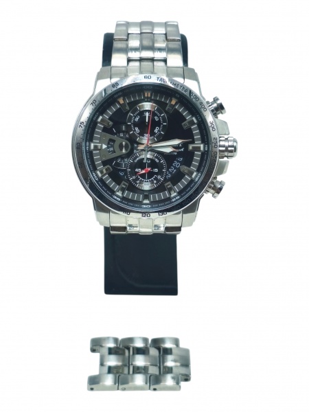 • RELÓGIO, um (1) relógio de pulso da marca ORIENT, modelo cronógrafo, resistente à água até 100m, com caixa e pulseira em aço, mostrador na cor preta com três registros auxiliares, aro com escala taquimétrica, excelente estado de conservação. No verso, com numeração MBSSC 031 / PPM-195. Não testado e sem garantia de funcionamento, caixa medindo 4,5cm de diâmetro sem a coroa.