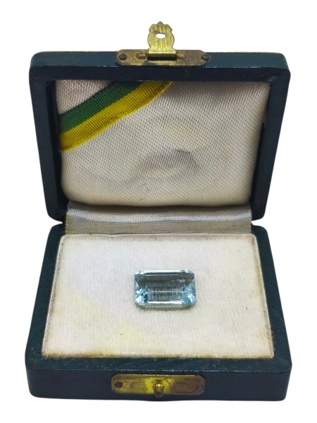 • PEDRA PRECIOSA, uma (1) pedra, provavelmente água-marinha, lapidação retangular facetada, em tonalidade azul-clara, acondicionada em estojo. Peça apresentando inclusões e sinais visíveis sob ampliação. Vendida no estado, sem garantia de autenticidade, quilatagem ou tratamento, medindo 1,5x1cm e peso em ct. 7.5.