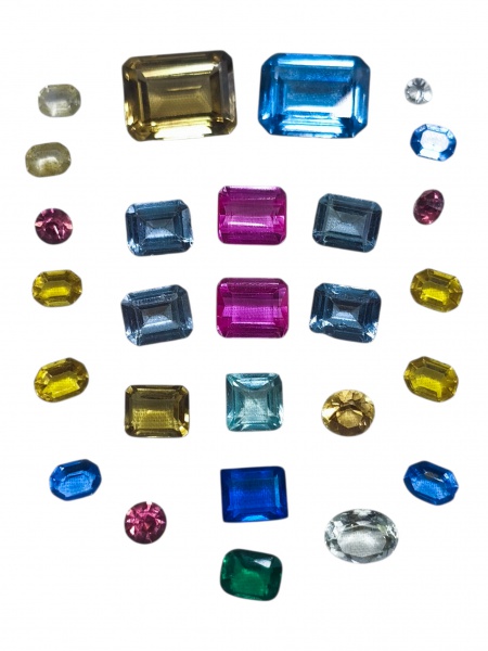 • PEDRAS PRECIOSAS, lote composto por vinte e sete (27) pedras avulsas de variadas lapidações e colorações, possivelmente para montagem ou reposição em joias, incluindo exemplares em cortes oval, redondo, quadrangular, retangular e oitavado, em tons de azul, rosa, amarelo, verde, fumê e incolor. O conjunto apresenta características visuais que podem remeter a pedras conhecidas, tais como topázio azul, ametista, citrino, cristal de rocha, granada, safira sintética, esmeralda sintética e quartzos coloridos, não sendo possível, contudo, atestar autenticidade, natureza ou classificação sem exame gemológico específico, peso em ct. 96,5.