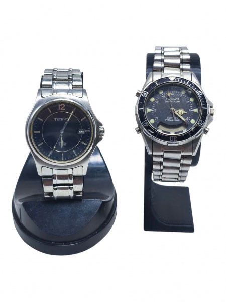 • RELÓGIOS, dois (2) relógios de pulso da marca TECHNOS, ambos com caixa e pulseira metálica, sendo: A) um (1) relógio com mostrador em tonalidade escura, calendário de data, indicação Steel e 5 ATM, apresentando sinais do tempo, riscos e desgastes de uso. No verso, com numeração GM12-MK / TMA0 24, caixa medindo 3,5cm e B) um (1) relógio modelo Skydiver Professional, com mostrador escuro, aro graduado, caixa em aço, apresentando sinais do tempo, riscos e desgastes de uso. No verso, com numeração TEC 9654 / TMA0 AG, caixa medindo 3,5cm. Ambos não testados e sem garantia de funcionamento.