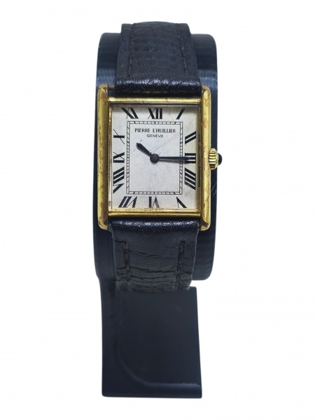 • RELÓGIO, um (1) relógio de pulso da marca PIERRE LHUILLIER GENÈVE (marca suíça de relógios vintage, associada à cidade de Genebra e registrada no comércio relojoeiro por meio da Louis-A. Leuba S.A., com uso da denominação já em circulação desde ao menos a década de 1970, embora hoje haja escassa documentação histórica disponível), com caixa retangular em metal dourado e pulseira em couro preto. Mostrador claro com numeração em algarismos romanos, em desenho clássico, falhas na douração da caixa, não testado e sem garantia de funcionamento, pulseira com desgastes, caixa medindo 2,3x2,3cm.