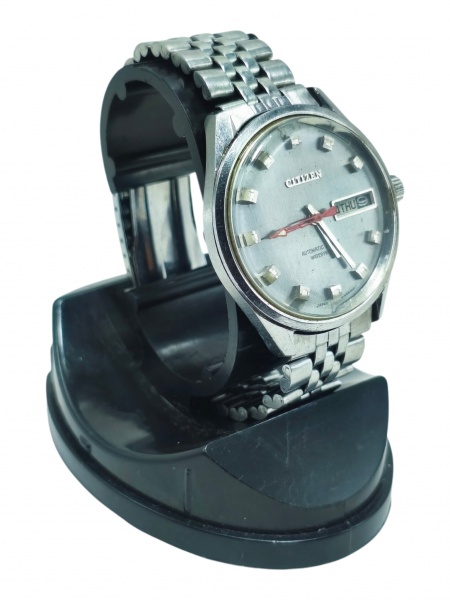 • RELÓGIO, um (1) relógio de pulso da marca Citizen (marca japonesa fundada em 1918, reconhecida mundialmente pela produção de relógios de precisão e por sua tradição em tecnologia relojoeira), com movimento automático, caixa circular e pulseira em aço, mostrador prateado com calendário duplo de dia e data, fundo com numeração 4-823629 Y, 67-1059 e 8010164, apresentando sinais de uso, riscos no visor, funcionando, porém, sem garantias futuras, caixa medindo 3,8cm.