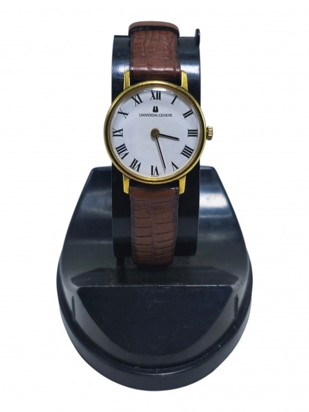 • RELÓGIO, um (1) relógio de pulso da marca UNIVERSAL GENÈVE (tradicional manufatura suíça fundada em 1894, reconhecida internacionalmente por seus relógios de apurado desenho e qualidade relojoeira), com caixa circular em metal dourado e pulseira em couro marrom. Mostrador claro com numeração em algarismos romanos, em desenho clássico. Verso apresentando a numeração 5118601 e 394720, em bom estado de conservação, pulseira com leves desgastes, caixa medindo 2,5cm de diâmetro.