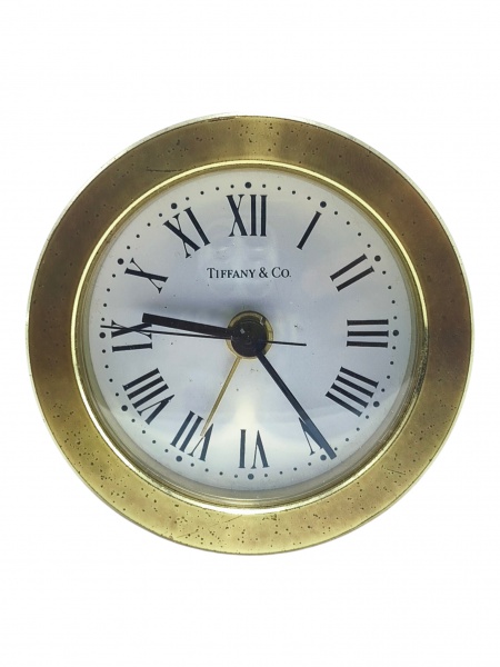 • RELÓGIO, um (1) relógio de mesa da marca TIFFANY & CO. (tradicional joalheria e maison norte-americana fundada em 1837, reconhecida internacionalmente por seus objetos de luxo, pratarias, joias e peças de decoração), em formato cilíndrico, com caixa em metal dourado, mostrador claro com numeração em algarismos romanos e mecanismo de alarme. Base marcada Made in Germany, sinais de oxidação, não testado e sem garantia de funcionamento, medindo 7cm de diâmetro.