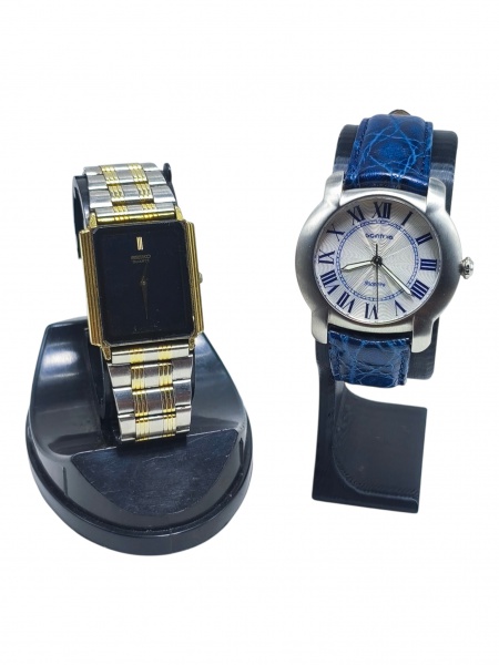 • RELÓGIOS, dois (2) relógios de pulso, sendo: A) um da marca Seiko Quartz (tradicional marca japonesa fundada em 1881, reconhecida mundialmente pela qualidade de seus relógios e pela relevância histórica na relojoaria, inclusive como uma das pioneiras na popularização dos mecanismos quartz), com movimento quartz, caixa retangular em metal dourado, mostrador preto, pulseira em aço bicolor, fundo em aço com numeração 7N39-5A90 e 330345, visor com ranhuras e pulseira adaptada da marca ORIENT, caixa medindo 2,5x2,7cm, e B) um da marca Goettems (marca brasileira tradicional no segmento relojoeiro, conhecida pela produção de relógios de estilo clássico e contemporâneo no mercado nacional), com movimento quartz, caixa circular em metal prateado, mostrador claro com algarismos romanos, pulseira em couro azul, caixa medindo 3,5cm, apresentando leves sinais de uso, não testados e sem garantia de funcionamento.