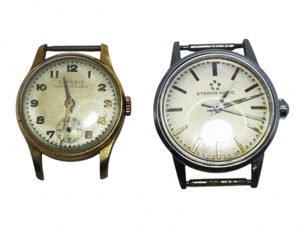 • RELÓGIOS, dois (2) relógios de pulso, sendo: A) um (1) relógio da marca CLASSIC, de corda, com caixa circular em metal dourado, mostrador claro com numeração arábica, pequeno segundo na porção inferior e inscrição 17 RUBIS; verso com indicações, não testado e sem garantia de funcionamento, medindo 2,7cm e B) um (1) relógio da marca ETERNA-MATIC (tradicional relojoaria suíça, reconhecida por sua produção de relógios automáticos de qualidade), com caixa circular em metal, mostrador claro com marcadores lineares aplicados e verso com numeração aparente 43863., caixa medindo 3cm, ambos com ausência da pulseira, não testados e sem garantia de funcionamento,
