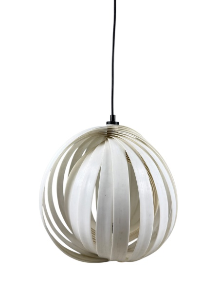 • LUSTRE, um (1) lustre para 1 lâmpada dito Verner Panton Moon, design clássico de 1960,(caracterizado por seu design em forma de leque, com lâminas em forma de anel perfeitamente posicionadas para fornecer uma luz suave, ambiente e sem ofuscamento), lâminas em material sintético na tonalidade branca, medindo 31cm de diâmetro.