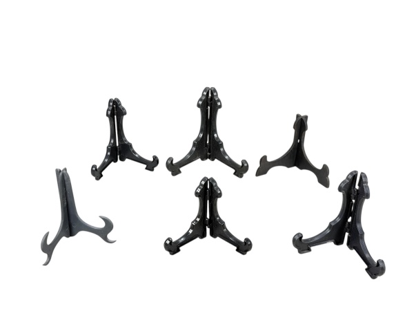 • DIVERSOS, seis (6) suportes para pratos de modelos, tamanhos e materiais distintos, sendo 4 em material plástico na tonalidade preta e 2 em madeira (1 com falhas na madeira), maior medindo 12,5x12,5cm e menor 9x10cm.