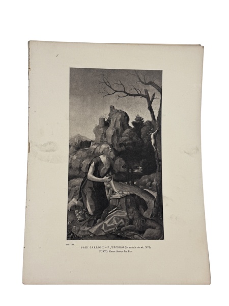 • REPRODUÇÕES, dezesseis (16) pranchas reproduzindo obras sacras, com imagens em preto e branco e legendas identificando artistas e acervos portugueses, incluindo Frei Carlos e o Mestre do Retábulo da Sé de Viseu. Peças apresentando sinais do tempo, medindo 40x40cm.