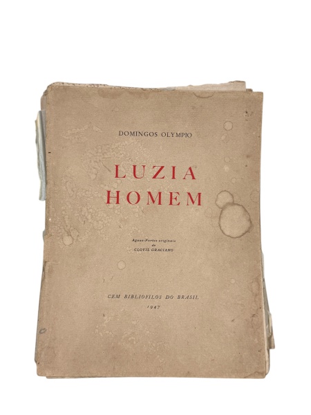 • LIVRO, um (1) exemplar da obra Luzia Homem, de Domingos Olympio, com águas-fortes originais de Clóvis Graciano, edição Cem Bibliófilos do Brasil, datada de 1947, apresentando capa brochura, folhas soltas, manchas de umidade, foxing, desgastes, vincos, rasgos, perdas, marcas do tempo e do manuseio. No estado.