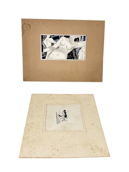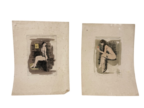 • ASS. DESCONHECIDA, duas (2) composições figurativas sobre papel, representando nu feminino, em técnica mista, ambas assinadas. Peças apresentando manchas, foxing e marcas do tempo, medindo 20,5x15cm somente a pintura.