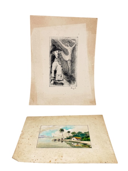 • GRAVURAS, lote com duas (2) peças, sendo: A) uma (1) gravura em preto e branco, assinada e datada 57, representando composição figurativa de nu feminino, medindo 37,5x27,5cm e B) J. GELLI (?), uma (1) pequena aquarela ou guache sobre papel, representando paisagem litorânea com coqueiros e casa, assinada no canto inferior, medindo 20,5x27,5cm. Peças apresentando manchas, foxing, desgastes, vincos e sinais do tempo.