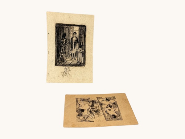 • Tomaz Santa Rosa Junior (19091956), duas (2) gravuras ou estudos gráficos atribuídos a SANTA ROSA, montados em passe-partout, sendo: A) composição figurativa com nu feminino em policromia, medindo 8x15cm (somente pintura, sem o paspatur); e B) composição em preto e branco com nu feminino, medindo 9,5x10cm. Peças apresentando marcas do tempo.