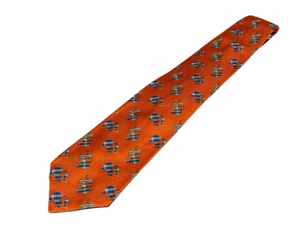 • INDUMENTÁRIA, uma (1) gravata da marca VALENTINO (tradicional grife italiana fundada em 1960, reconhecida internacionalmente por sua alta-costura, vestuário e acessórios de luxo), confeccionada em seda, Made in Italy, sobre fundo laranja, com padronagem figurativa composta por elefantes estilizados em policromia, modelo clássico, leves sinais de uso.