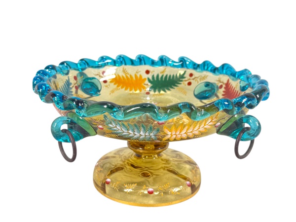 • MURANO, uma (1) fruteira confeccionada em vidro de Murano na tonalidade âmbar, bordas em gomos na tonalidade azul, decorado por elementos florais e vegetalistas em policromia, filetes em ouro e alças laterais em argola metálica, medindo 11x21cm.