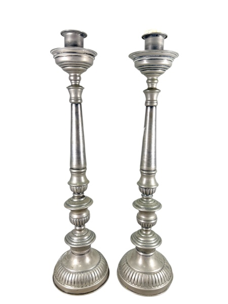 • ABAJURES, par (2) de tocheiros adaptados para abajur, confeccionados em metal niquelado, cinzelado por gomos, corpo torneado e base circular, medindo 63cm de altura, necessita troca das fiações elétricas.