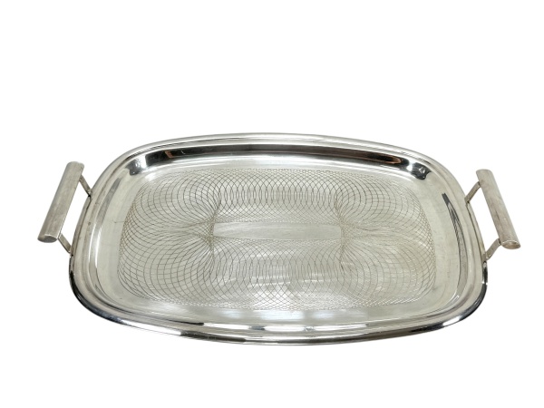 • METAL PRATEADO, uma (1) bandeja retangular confeccionada em metal espessurado da manufatura BELLINI, fundo cinzelado por elementos geométricos, borda escalonada e alças vazadas, medindo 50,5x35cm.
