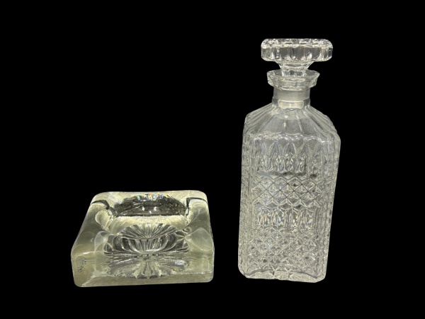• VIDROS, lote com duas (2) peças confeccionadas em vidro translucido, sendo: A) 1 garrafa para whisky, moldagem em BICO DE JACA e caneluras, medindo 24cm de altura e B) 1 cinzeiro quadrado, corpo liso e fundo estrelado, medindo 4,5x14,5x14,5cm.