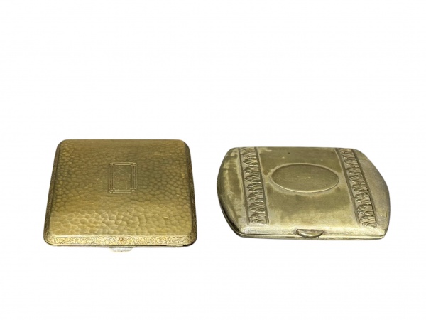 • METAL PRATEADO, lote com duas (2) cigarreiras confeccionadas em metal espessurado a prata, sendo: A) 1 com decoração martelada, cinzelado de elementos vegetalistas e gregas em reserva, falhas na prateação, medindo 9,5x7,5cm e B) 1 ao gosto art noveau, cinzelado por folhagens e cabochão em reserva monogramado, falhas na prateação, medindo 9x7,5cm.