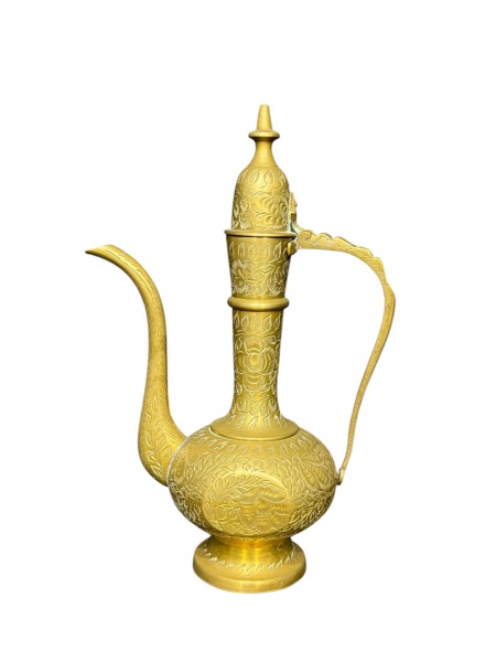 • BRONZE INDIANO, um (1) bule indiano confeccionado em bronze, ricamente cinzelado por elementos florais e vegetalistas, corpo torneado, alça lateral em recortes e pega da tampa no feitio de bilro, necessita solda na alça, medindo 23cm de altura.
