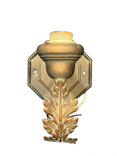 • LUMINÁRIA, uma (1) arandela para uma lâmpada confeccionado em metal cobreado, haste curva no feitio de arabesco com aplique de folhagem, base oitavada, apresenta sinais de oxidação, medindo 17,5x17x12cm.