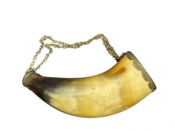 • DIVERSOS, um (1) cantil confeccionado em chifre polido, guarnecido em metal dourado com recortes na borda, corrente em metal prateado, medindo 15x5,5cm.