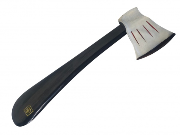 • CUTELARIA, um (1) machado oriental, lâmina em aço prateado com recortes e sulcos realçados em vermelho, cabo curvo em madeira laqueada na tonalidade preta, marcado MAY. 31,1997 e caracter em douração, medindo 32cm de comprimento.