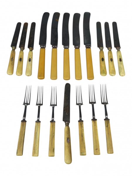 • METAL PRATEADO, lote com dezoito (18) peças com cabo em osso, sendo: A)  6 facas de sobremesa com lâmina em aço carbono, apresentando sinais de oxidação, B) 5 garfos para jantar com lâmina em aço carbono, apresenta sinais de oxidação e C) 6 garfos para sobremesa, peças de modelos e manufaturas distintas.