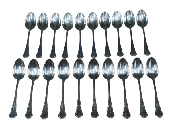 • CHRISTOFLE (É uma renomada marca francesa fundada em 1830 por Charles Christofle), vinte (20) colheres para sobremesa confeccionada em metal francês espessurado a prata, cabo cinzelado em caneluras com recortes, banho em bom estado de conservação.
