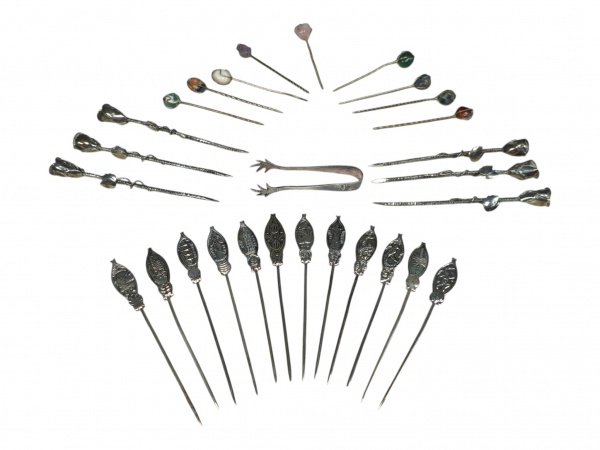 • METAL PRATEADO, vinte e oito (28) peças confeccionadas em metal espessurado a prata, sendo: A) 9 espetos para petiscos finalizados em pedra brasileira distinta, B) 12 espetos para petiscos com cabo cinzelado por figuras distintas, C) 6 espetos para petiscos com cinzelado representando flor e D) 1 pegador de açúcar.