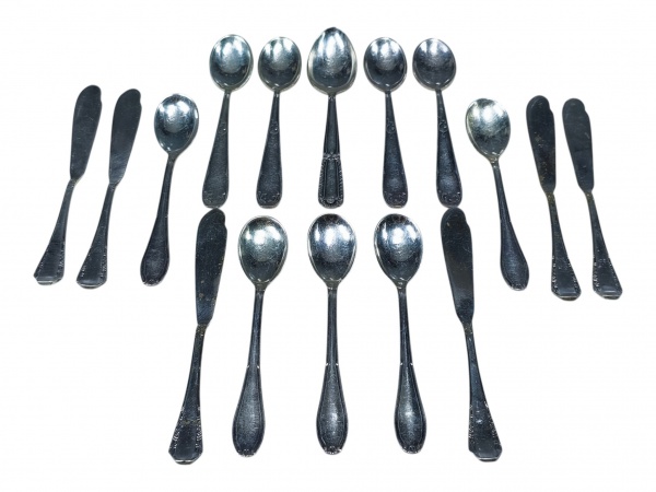 • METAL PRATEADO, lote com dezessete (17) peças confeccionadas em metal espessurado a prata de modelos, tamanhos e marcas distintas, sendo 10 colheres para chá, 1 para sobremesa e 6 espátulas para pastas, algumas com falhas na prateação.