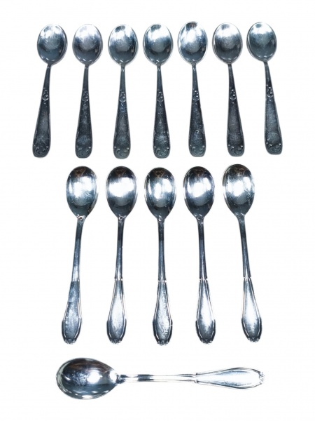 • METAL PRATEADO, lote com treze (13) colheres para chá confeccionadas em metal espessurado a prata, sendo 6 da manufatura EBERLE, cabo cinzelado finalizado por folhagens e 7 da manufatura BEL PRATA, cabo cinzelado por arabescos.